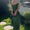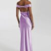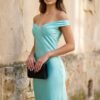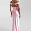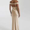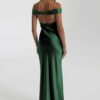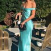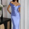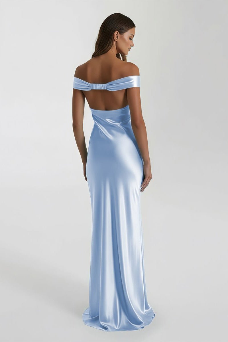 An off-shoulder satin prom dress with a mermaid silhouette, designed for refined evening occasions.