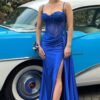 A spaghetti strap satin mermaid prom dress designed to highlight curves with a smooth, elegant finish.