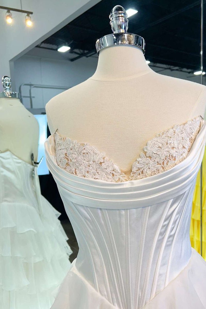 A strapless satin prom dress with an elegant A-line silhouette designed for formal evenings.